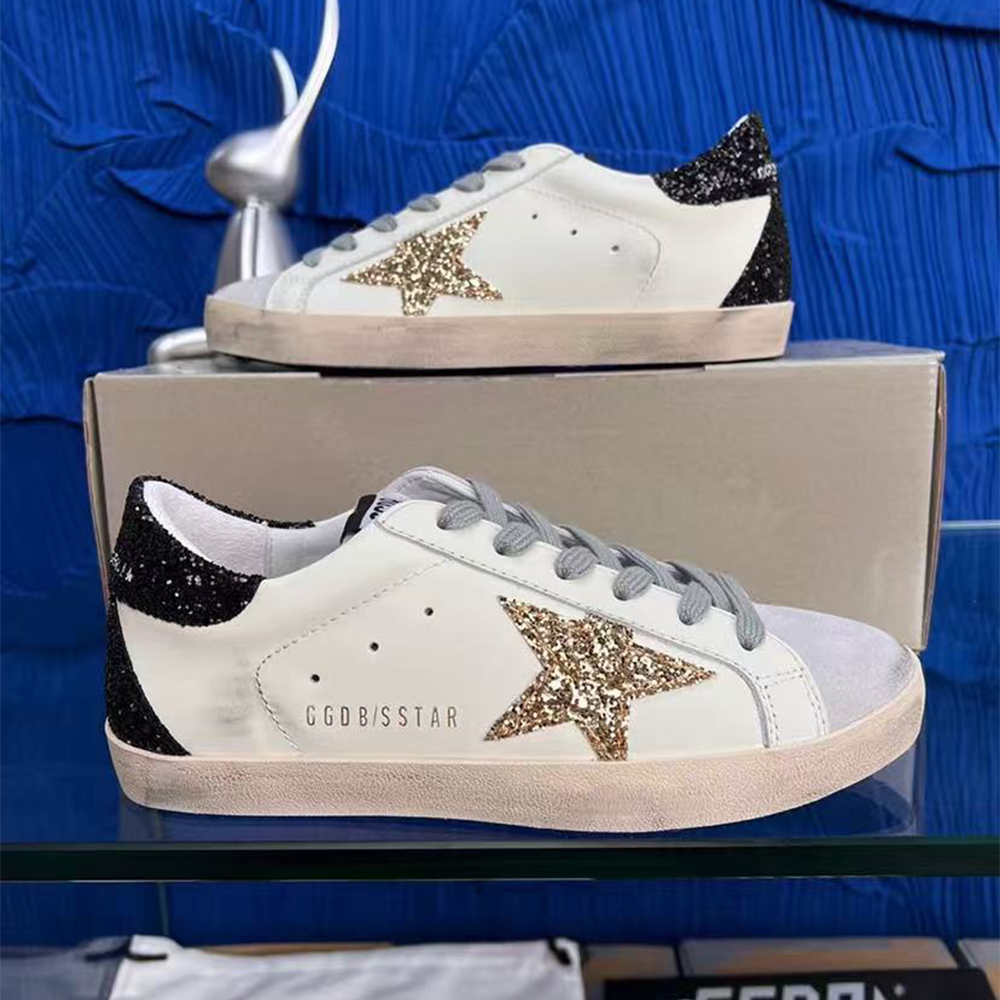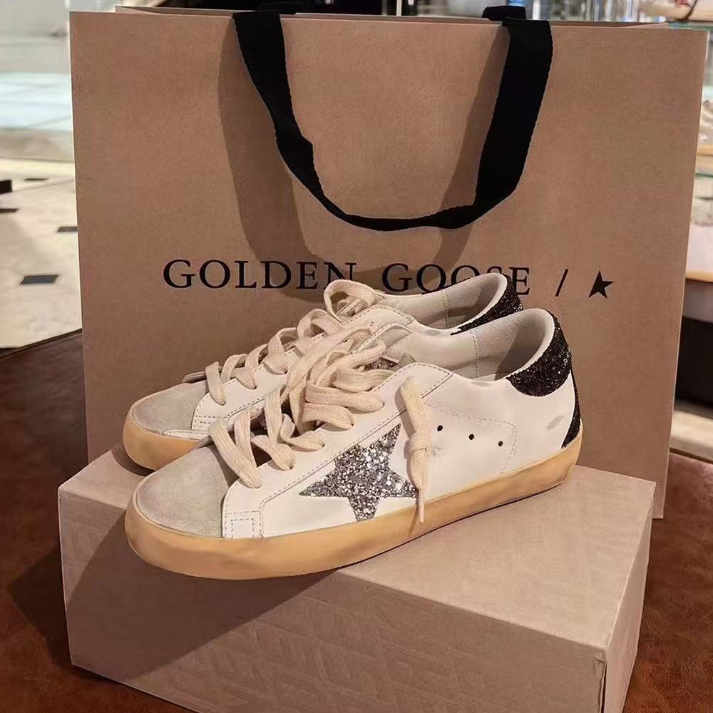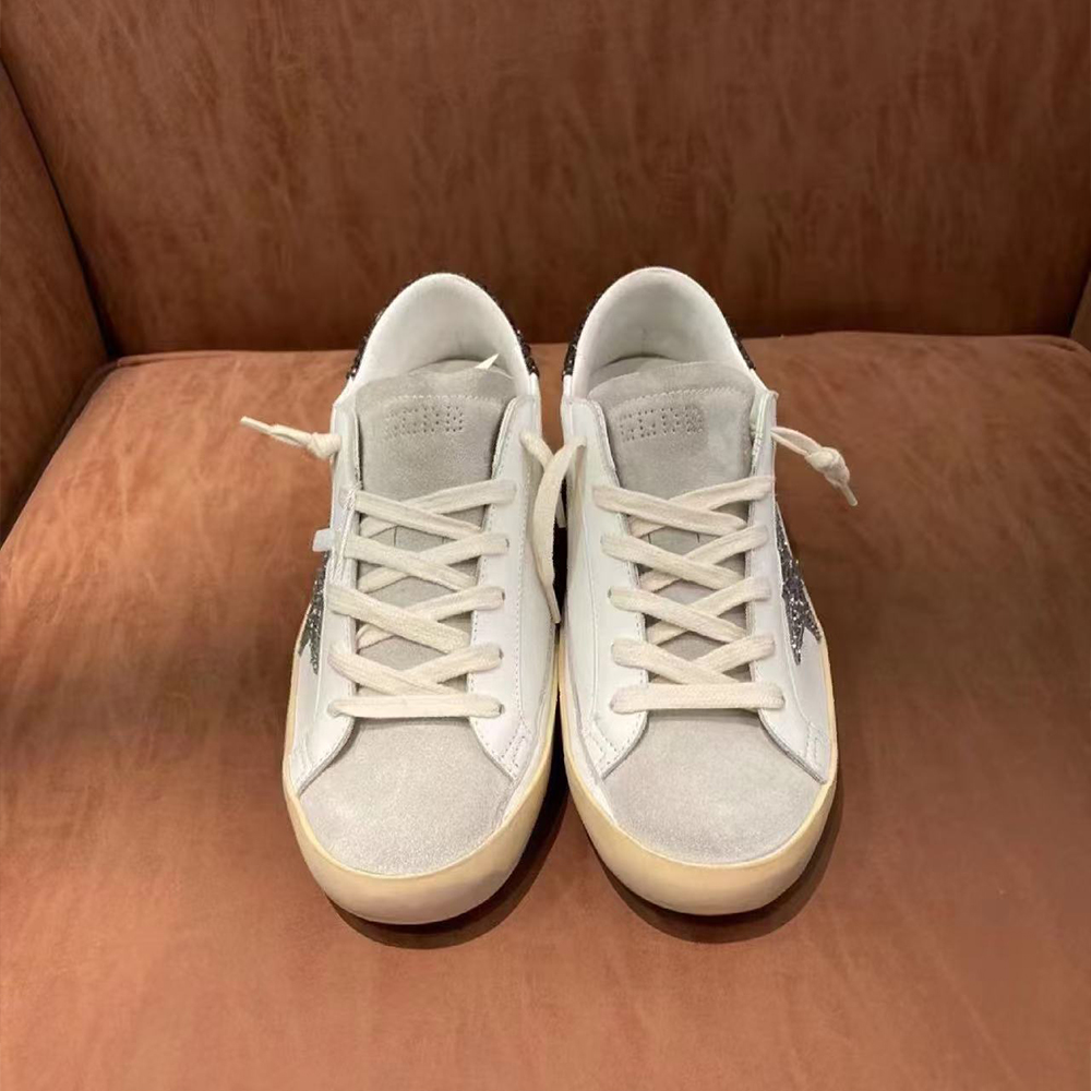 A timeless classic, yet constantly evolving with the times. Golden loves to constantly reinterpret our classics from a fresh perspective. This Super-Star sneaker features a white leather upper embellished with a silver glitter star pattern and a brown glitter tab. A brown glitter back insert, icy grey suede tongue, and cream laces add the finishing touches.