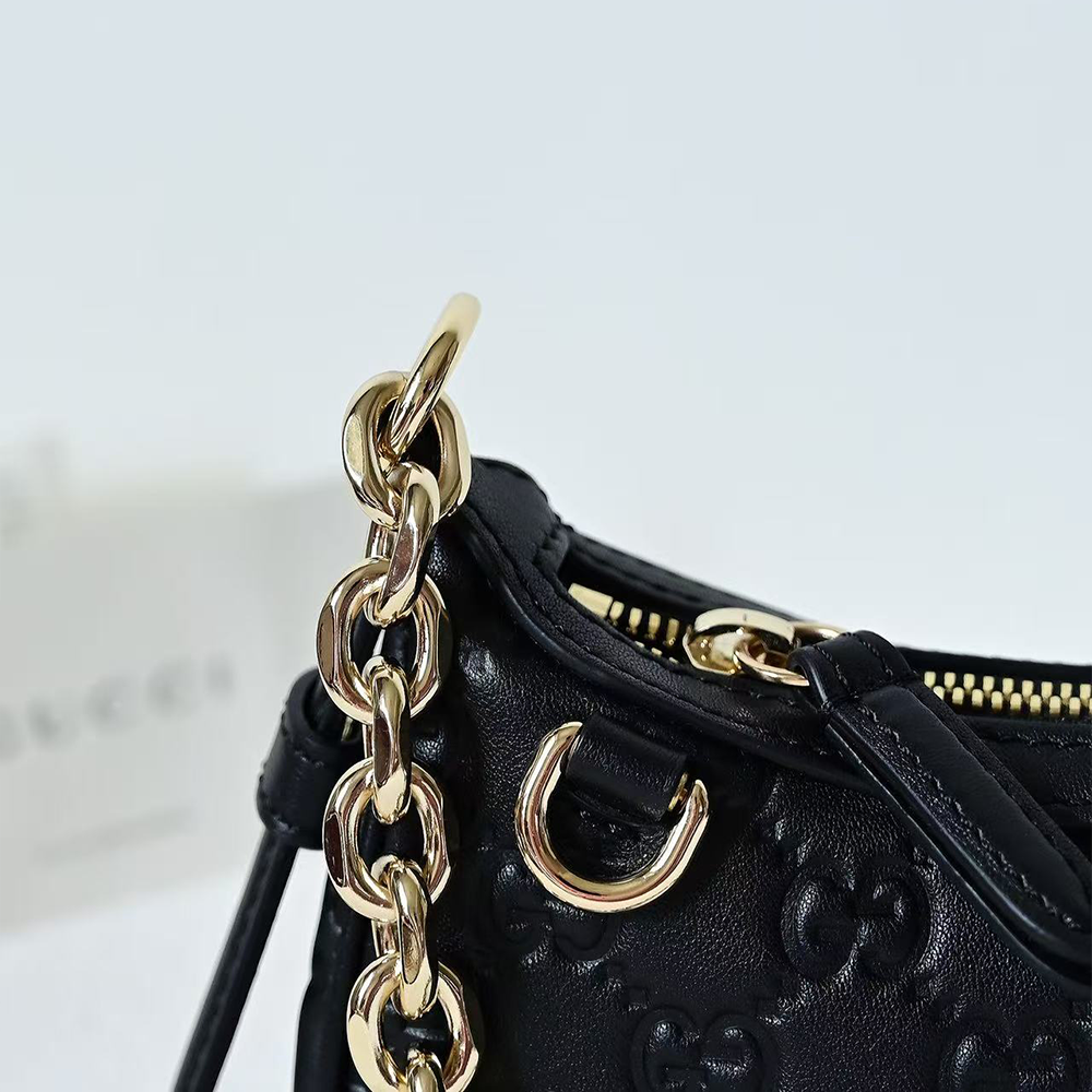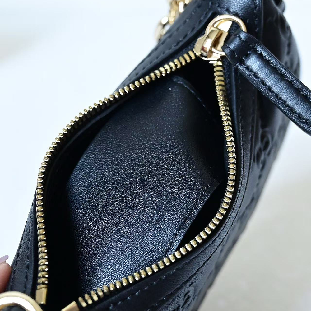 In the Fall Winter 2025 collection, part of the GG Emblem line, this small shoulder bag features a rounded silhouette, gold-toned hardware, and a chain strap. The zip closure opens to an interior with a card pocket, lined in cotton linen for a refined finish.