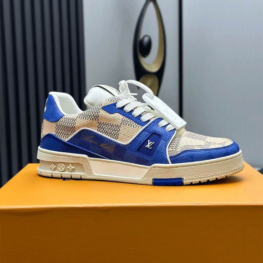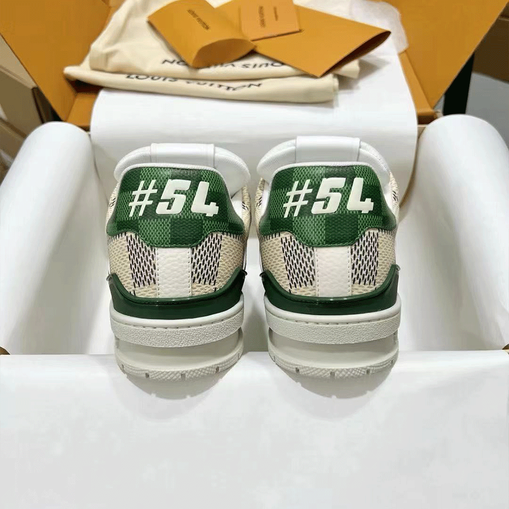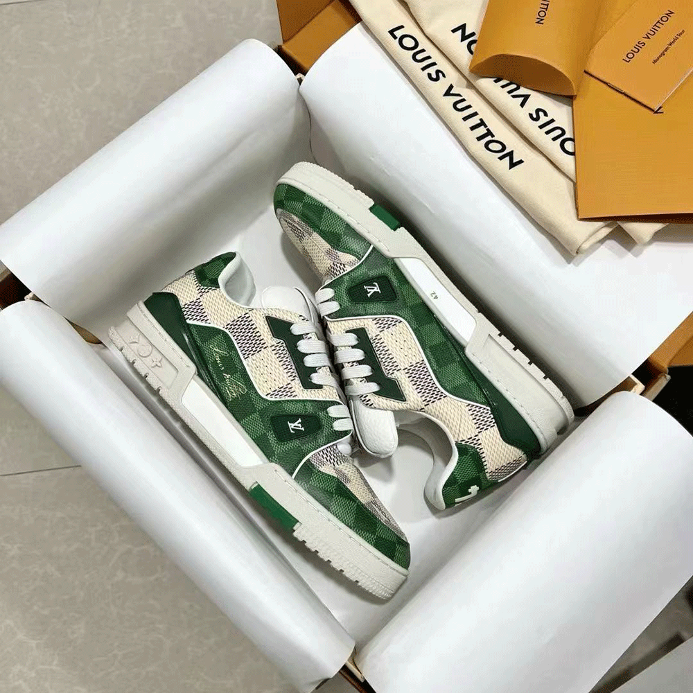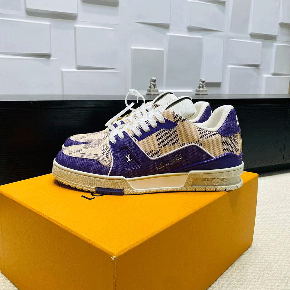 This LV Trainer sneaker features Damier grained calfskin leather, a play of color and proportion, and continues the signature touch with a detailed upper and embossed Louis Vuitton signature in a handwritten script on the side. Designed by Virgil Abloh, this classic silhouette is inspired by vintage basketball shoes.