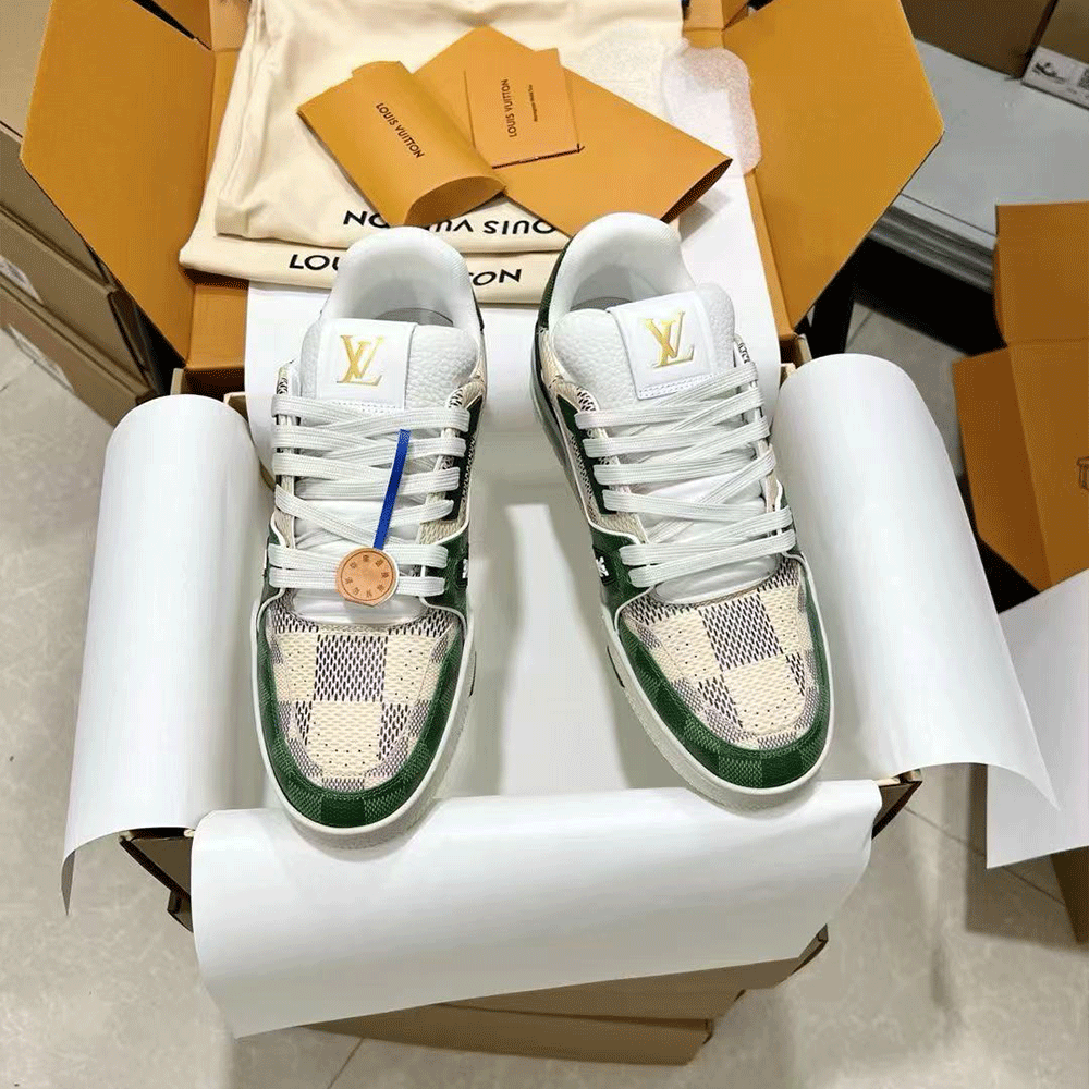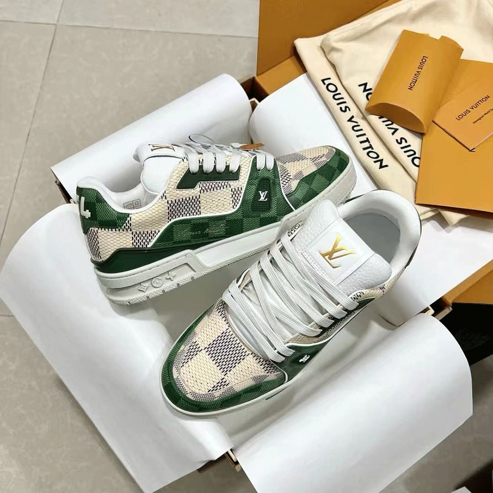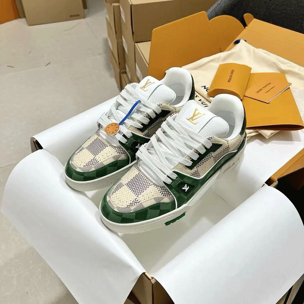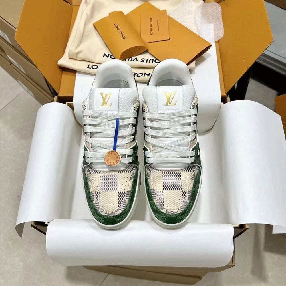 This LV Trainer sneaker features Damier grained calfskin leather, a play of color and proportion, and continues the signature touch with a detailed upper and embossed Louis Vuitton signature in a handwritten script on the side. Designed by Virgil Abloh, this classic silhouette is inspired by vintage basketball shoes.
