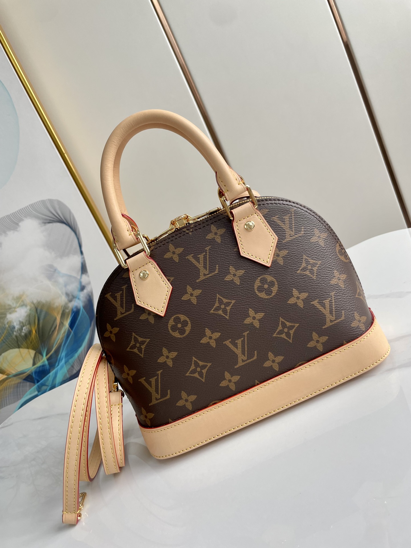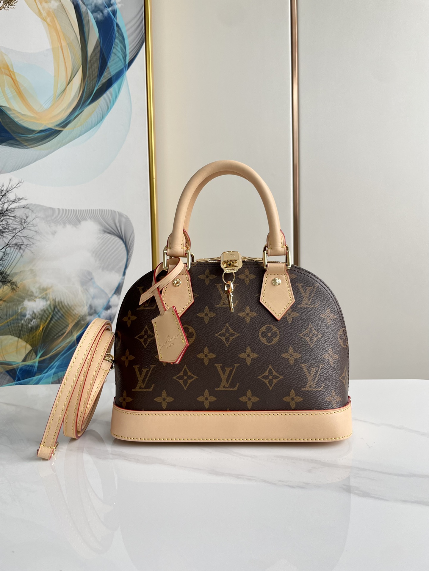 Product detailsThe Alma BB handbag traces its pedigree to an Art Deco original, introduced in 1934. Signature details impart a timeless elegance to this model crafted from iconic Monogram canvas: note the golden padlock and keys, two Toron handles and smart leather key bell. Fitted with a detachable and adjustable strap, this charming small bag is perfect for cross-body wear.23.5 x 17.5 x 11.5 cm(Depth x Height x Width)Monogram coated canvasNatural cowhide leather trimTextile liningGold-color hardwareDouble zip closurePadlockKey bellInside flat pocket4 protective metal bottom studsStrap: Removable, adjustableStrap Drop: 50.0 cmStrap Drop Max.: 62.0 cmHandle: Double